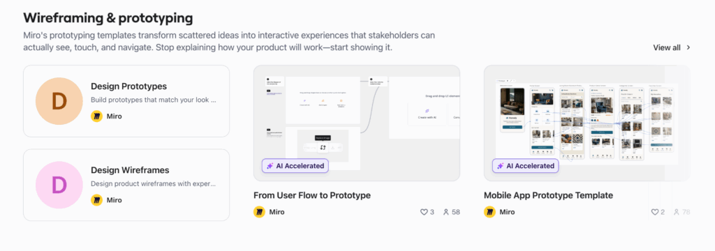 Miro is a great example of how available resources could be leveraged to help users and attract more SEO traffic. Their templates section provides lots of different templates for workflows, wireframes etc. created both by the Miro team, and members of its community.